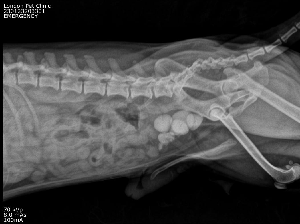 Abdominal Radiographs: Multiple radiopaque uroliths visible in the bladder