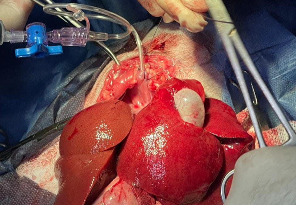 Stomach and intestines exteriorized and liver can be seen inside the thoracic cavity