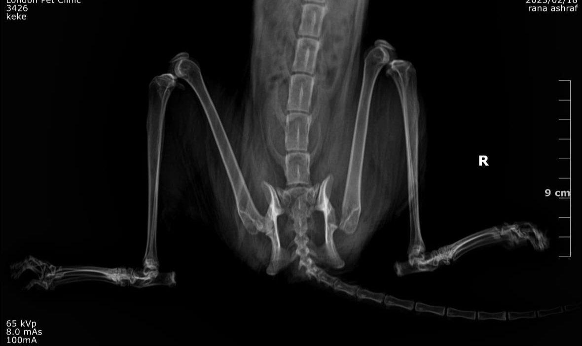 A 1.5-year-old male Scottish Shorthair cat was presented to the clinic with a history of progressive hindlimb lameness and difficulty jumping.