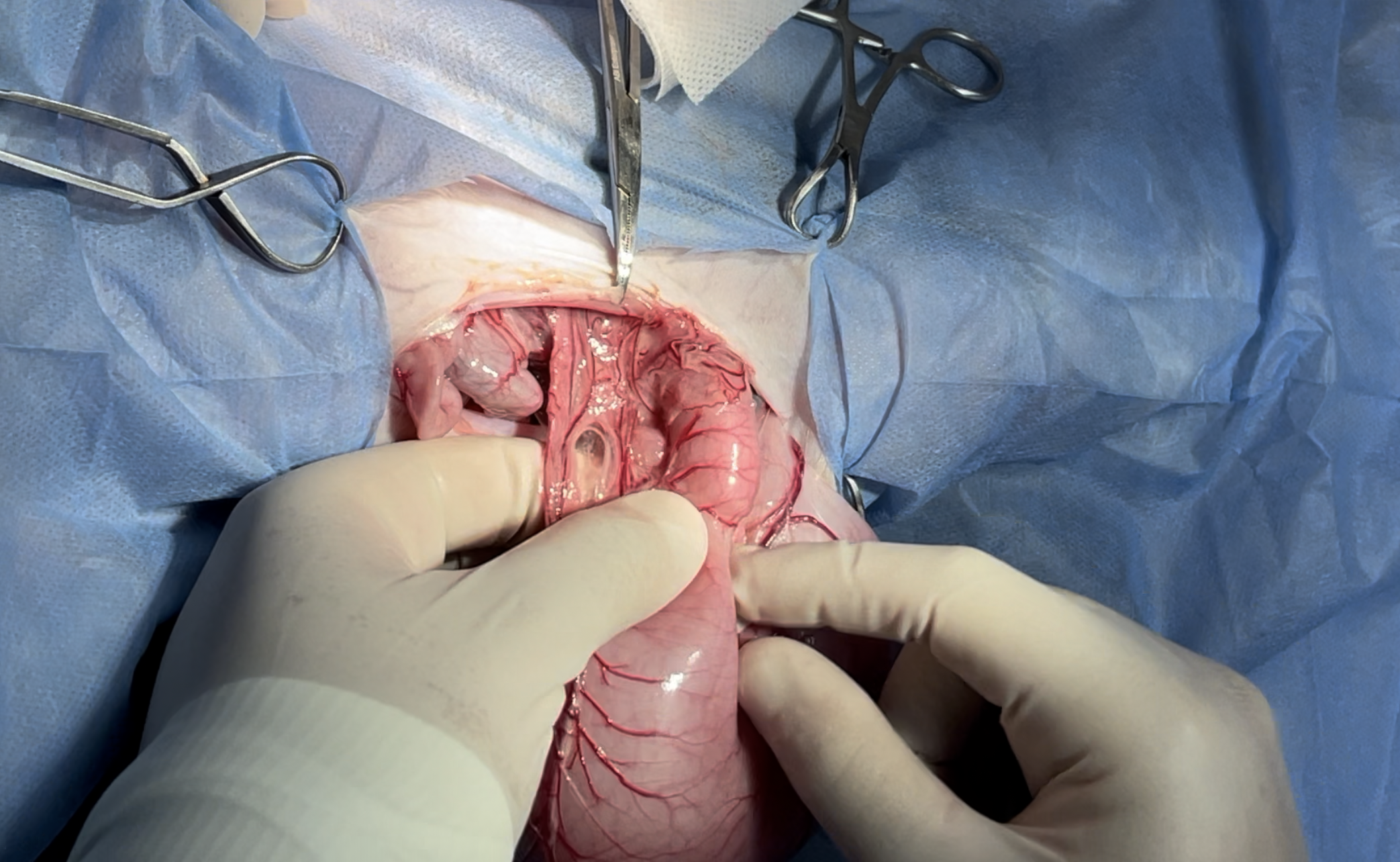 Abdominal radiographs revealed a markedly distended stomach filled with fluid and gas, with a distinct fluid–gas interface visible in the cranial abdomen