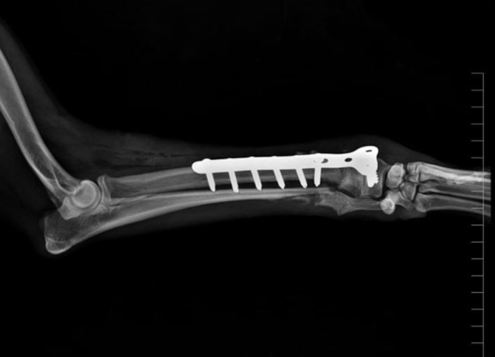 The owner reported sudden pain and swelling around the distal forelimb, with the dog unable to bear weight immediately following the incident. No prior orthopedic history was noted.